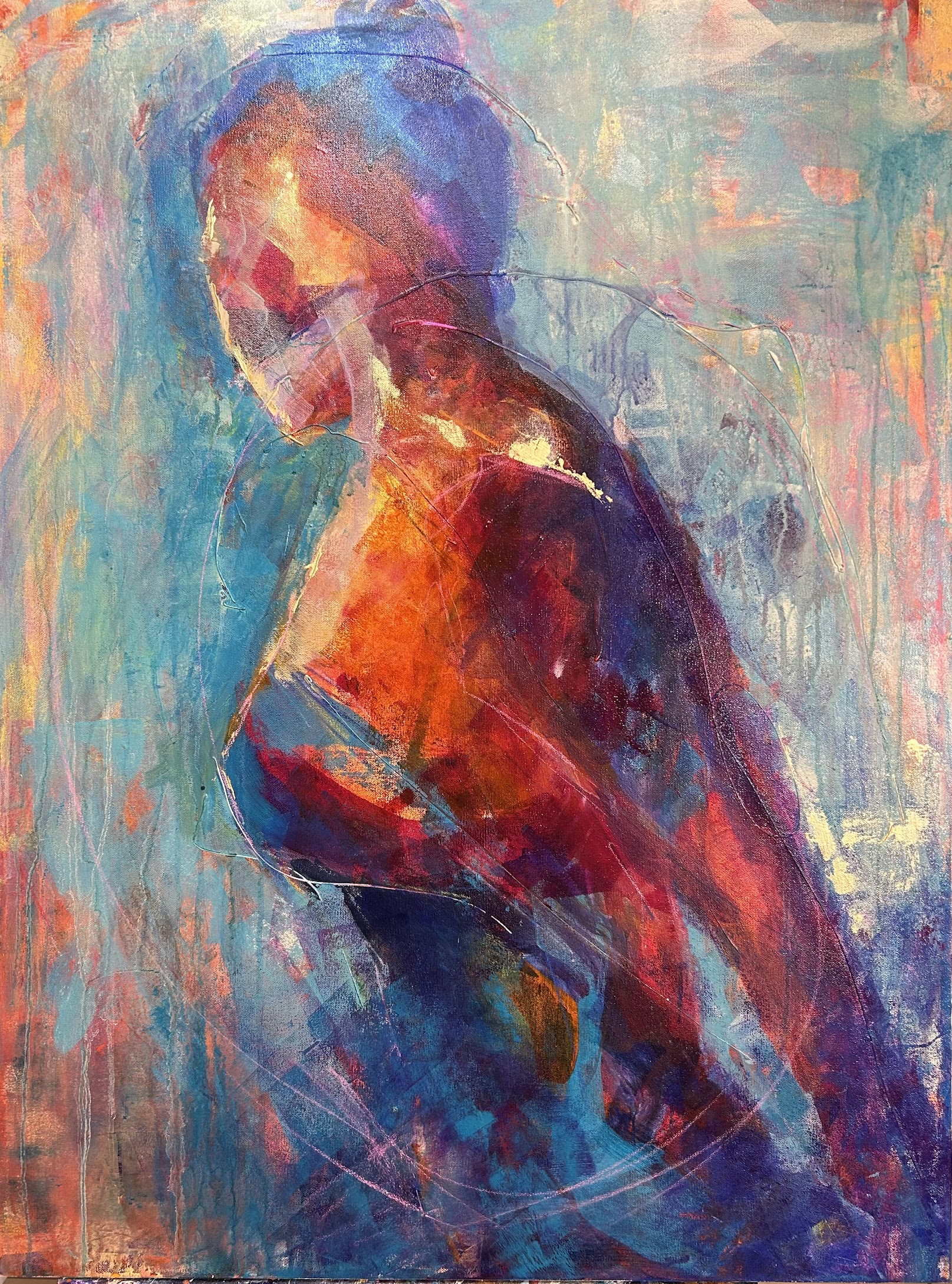 Abstract figure painting where the lines between the subject and background are not distinct, both melding into each other.